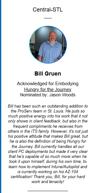 ITS core values are CHOP. Client success is our success > Hungry for the journey > Ownership thinking > Passionate problem solving > Surrender the ego. I’ve been recognized multiple times for CHOPS, including here and here.